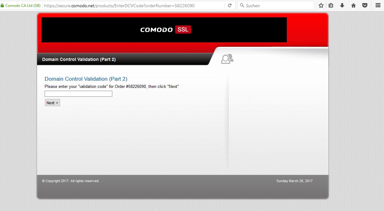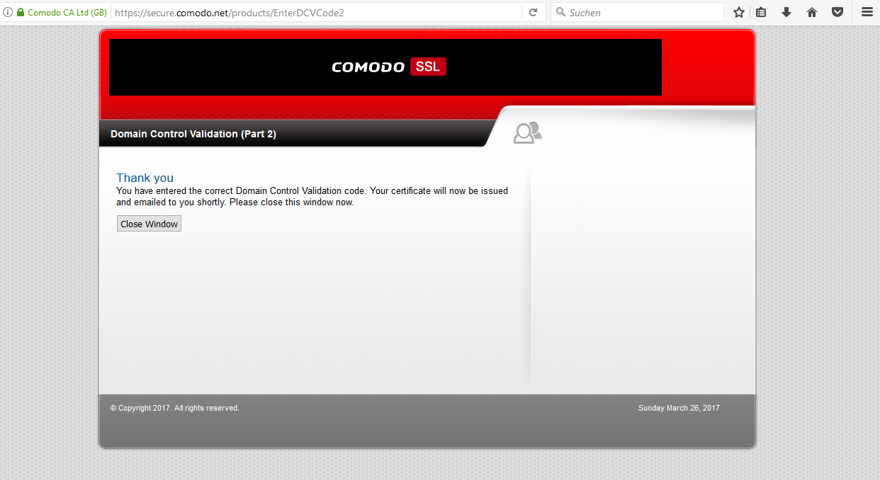 Damit ist bereits der Prüfprozess der "Domain Control Validation" beendet und Sie erhalten in den nächsten Minuten Ihr SSL Zertifikat ihre_domain.crt Domain per Email zugesandt. Oder Sie öffnen das Control Panel und laden sich das Zertifkat herunter. Nun können Sie die Installation Ihres SSL Zertifikates in Ihrem System abschließen.
